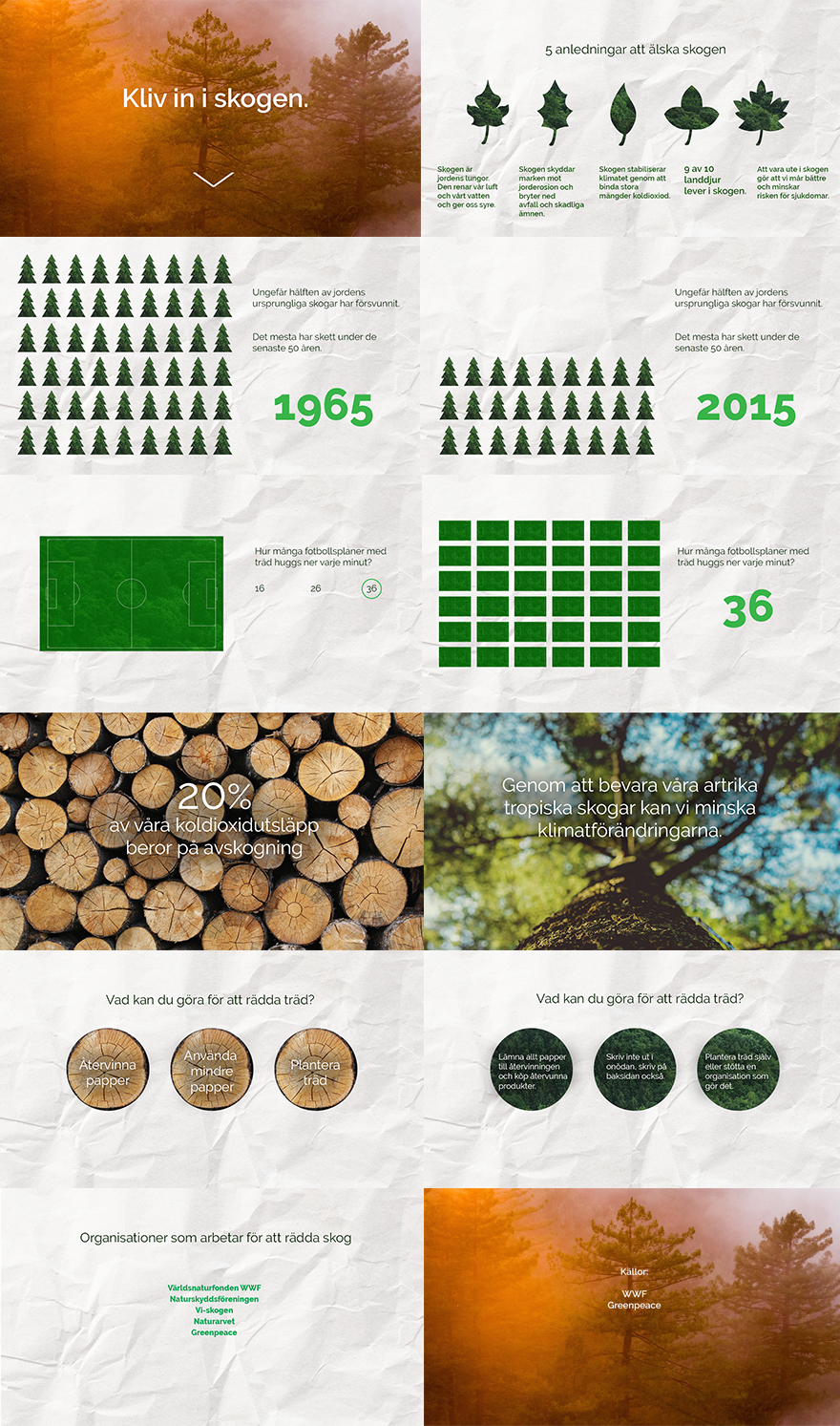 Efter detta kommer lösningen där jag visar vad man som individ kan göra för att rädda träd. Jag länkar även till organisationer så att besökaren kan klicka sig vidare, läsa mer och kanske stödja någon av dem.