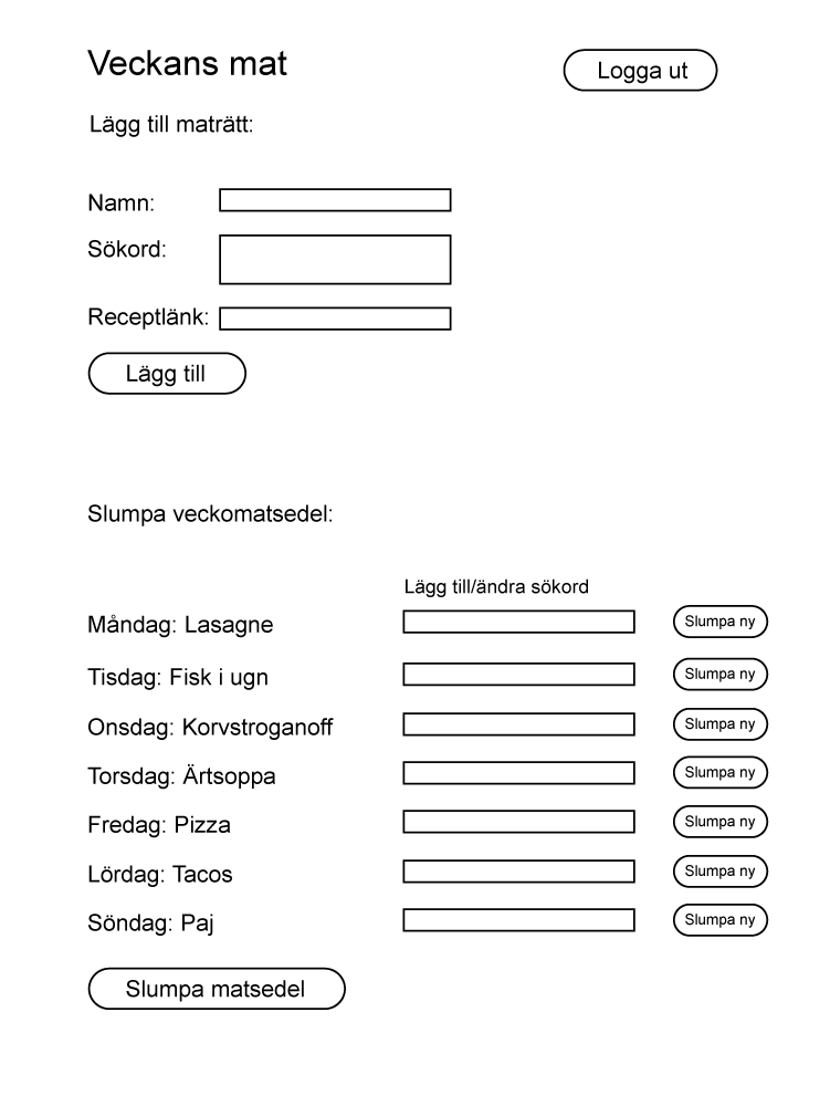 Du kan sedan slumpa fram en veckomatsedel. Du kan välja specifika sökord för de olika veckodagarna, t.ex. soppa på torsdag.